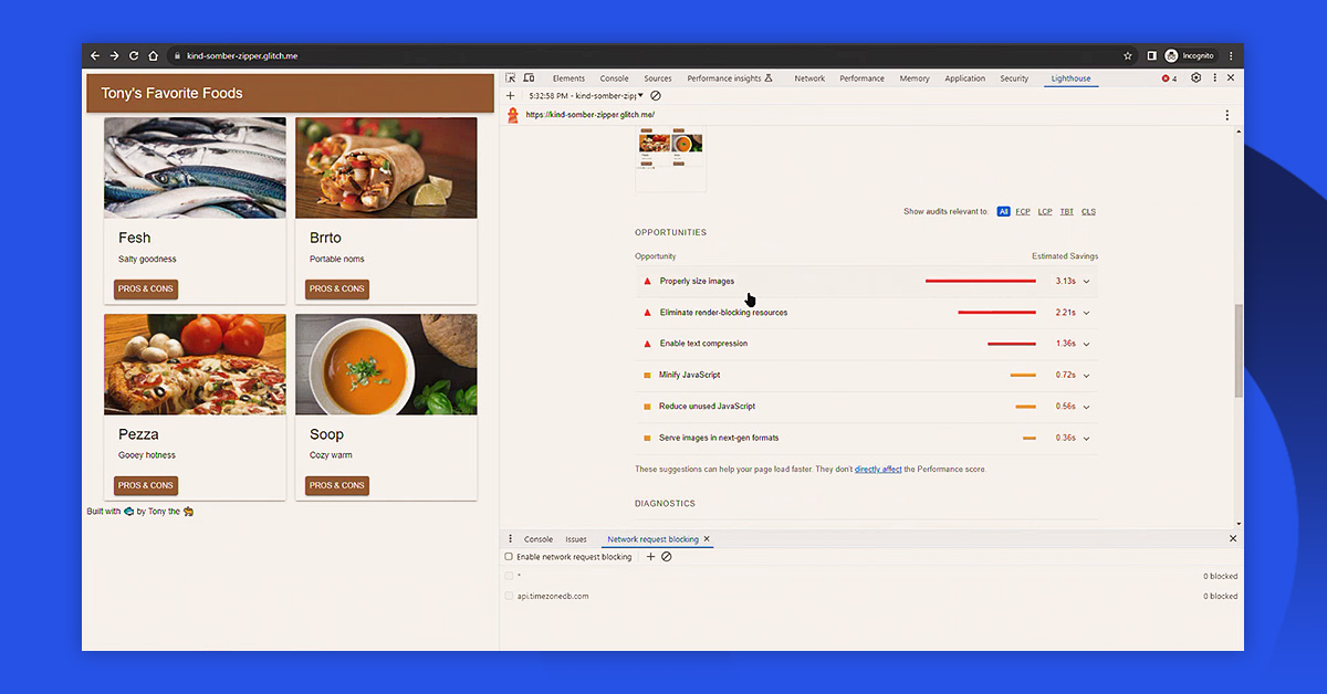 “Unlike the Performance tab where you make a recording, in Lighthouse you run an audit that gives you a score on how well your application performs,” Sivliu explains. “Lighthouse also gives you tips on how to improve performance.”