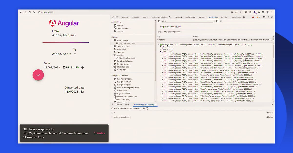 “The Network tab interacts with all requests leaving our application. It shows the history in a waterfall view,” Cristian demonstrates. “You can throttle to simulate a worse network and block certain requests to simulate backend failures.”