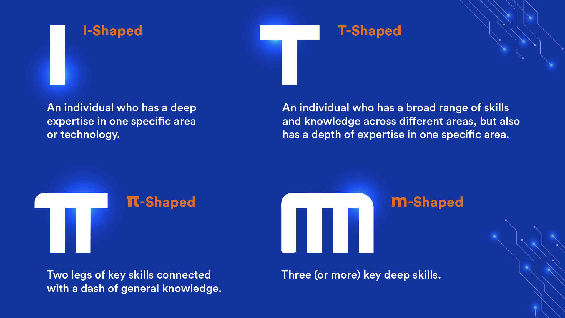 - T-shape: with a depth of expertise in one area of technology, combined with other skills and broad knowledge.