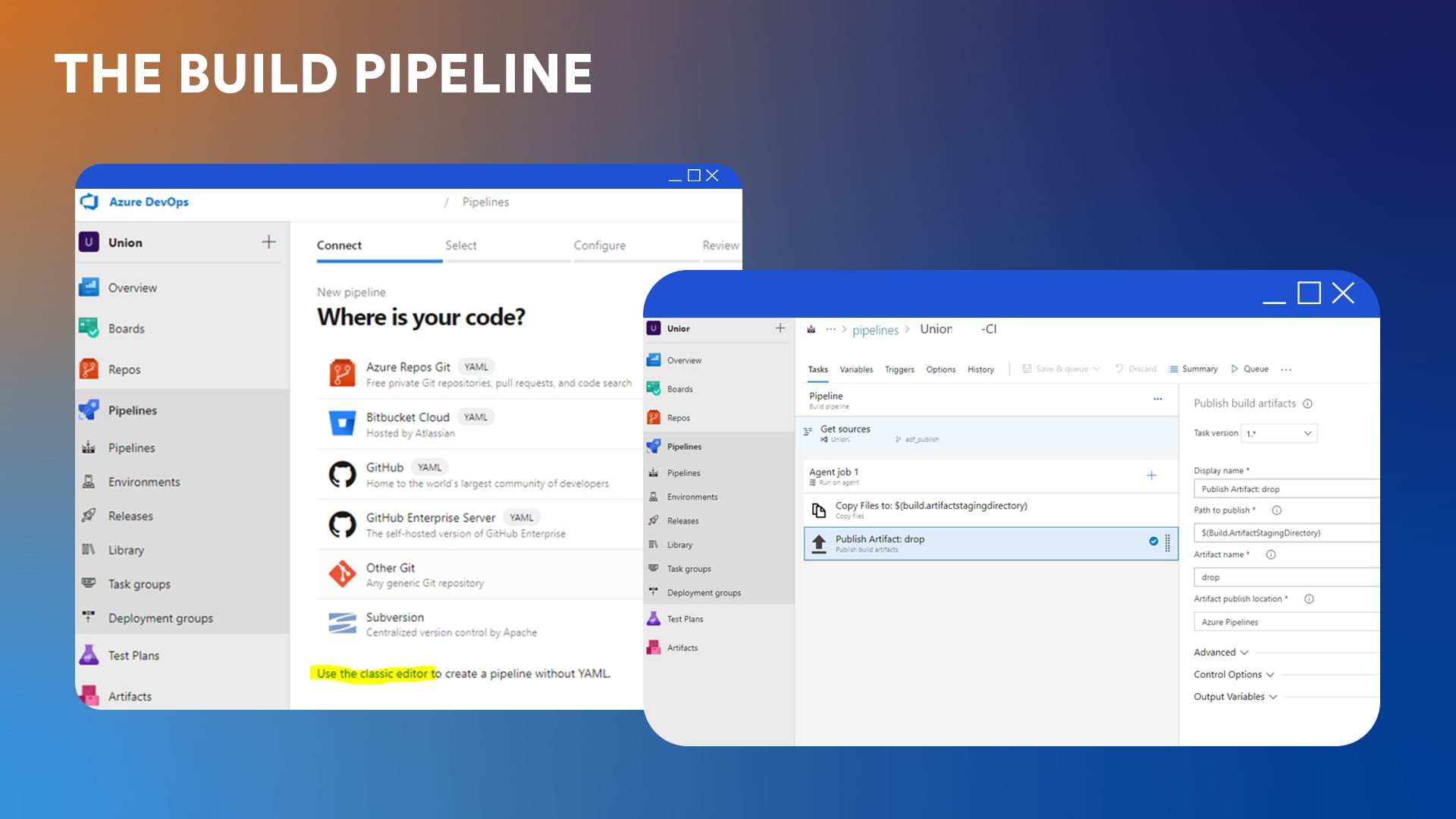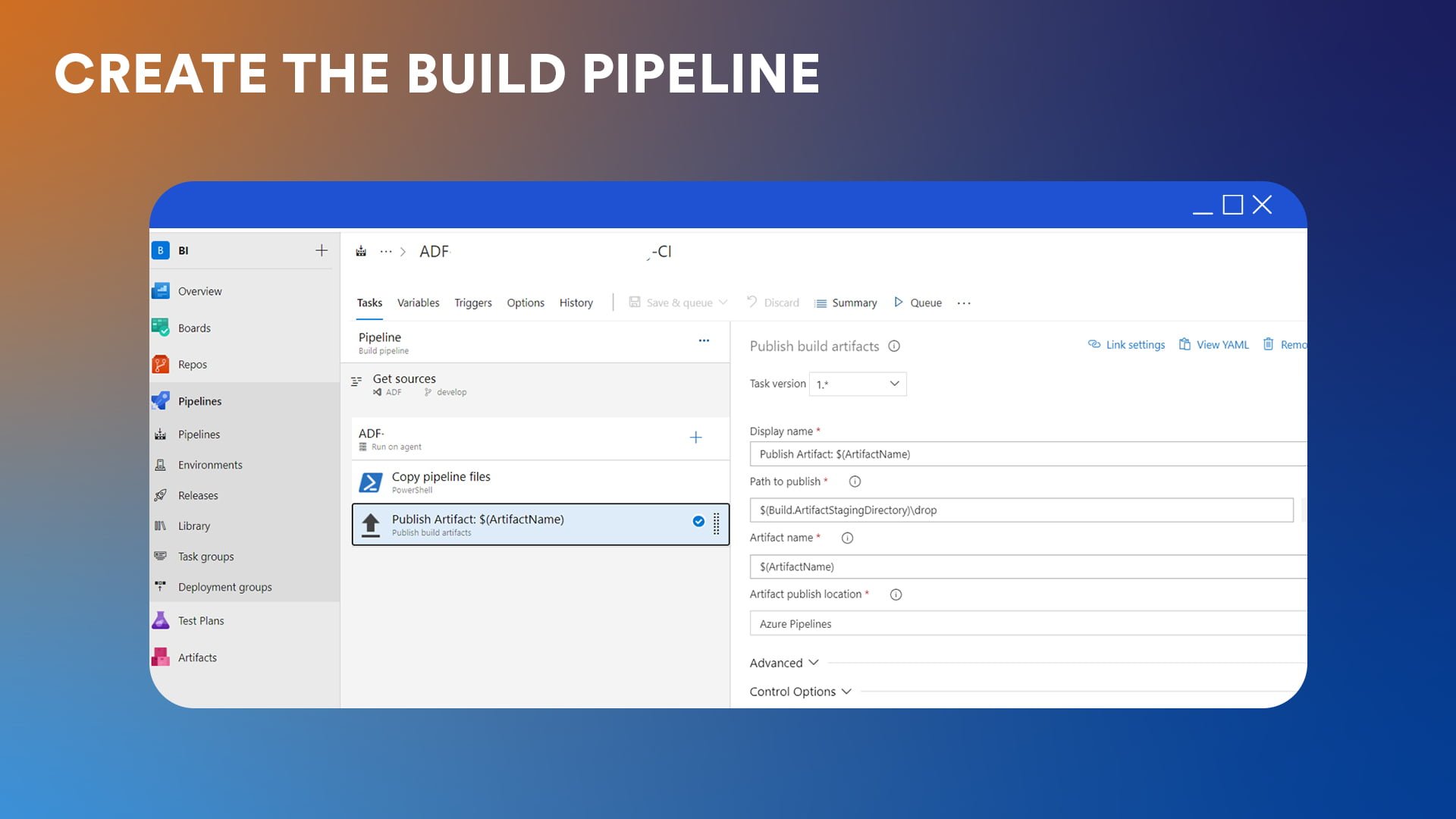 For this, you can use either the classic editor or YAML configuration files. Carmen prefers the classic editor for simplicity. This step simply copies the branch files and publishes the artifact without any customisation. It can be triggered automatically when we publish from the ADF collaboration branch.