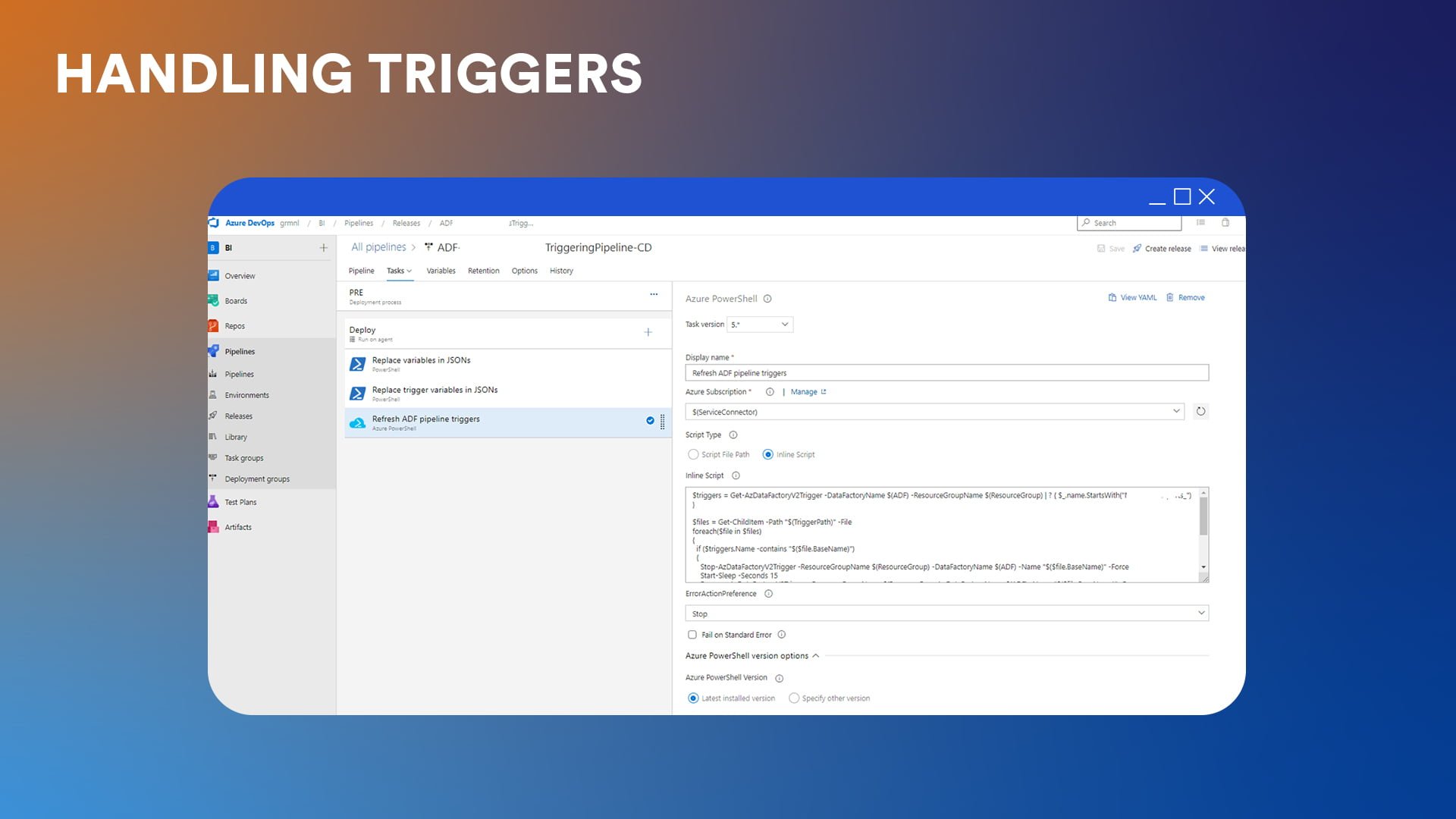 - The power of PowerShell: Be it parameter change or trigger management, PowerShell scripts bring a lot of value. If you are not used to writing code in PowerShell, your first try might prove tricky. Both Diana and Carmen advise you to not give up immediately or request assistance from a DevOps specialist. PowerShell is not the only option you can count on. For example, if you are more comfortable with Python, you can use a Python Script task to perform the operations you need.
