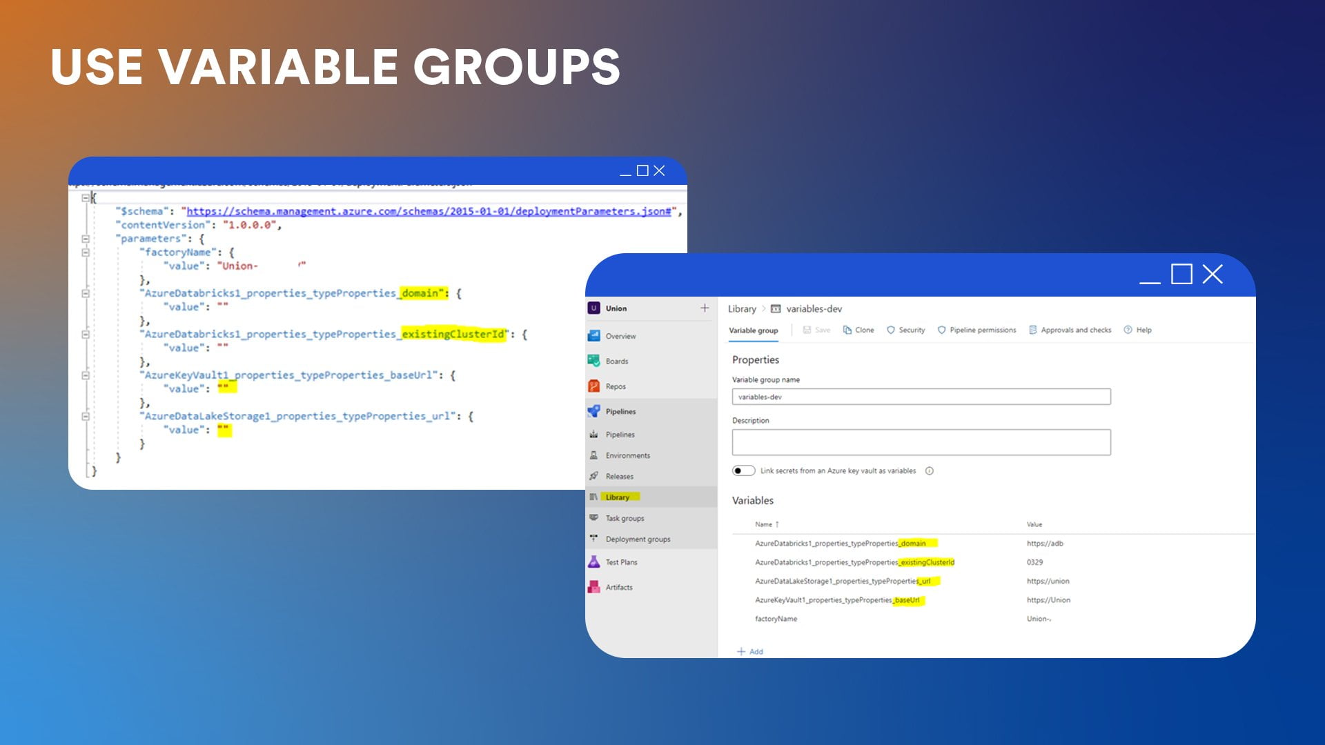 Similar to ARM template parameters, you can also configure variables inside your JSON files: “You can parameterize any property in the JSON definitions. And it’s much easier to do hotfixes by modifying a single object file.” Diana mentions.