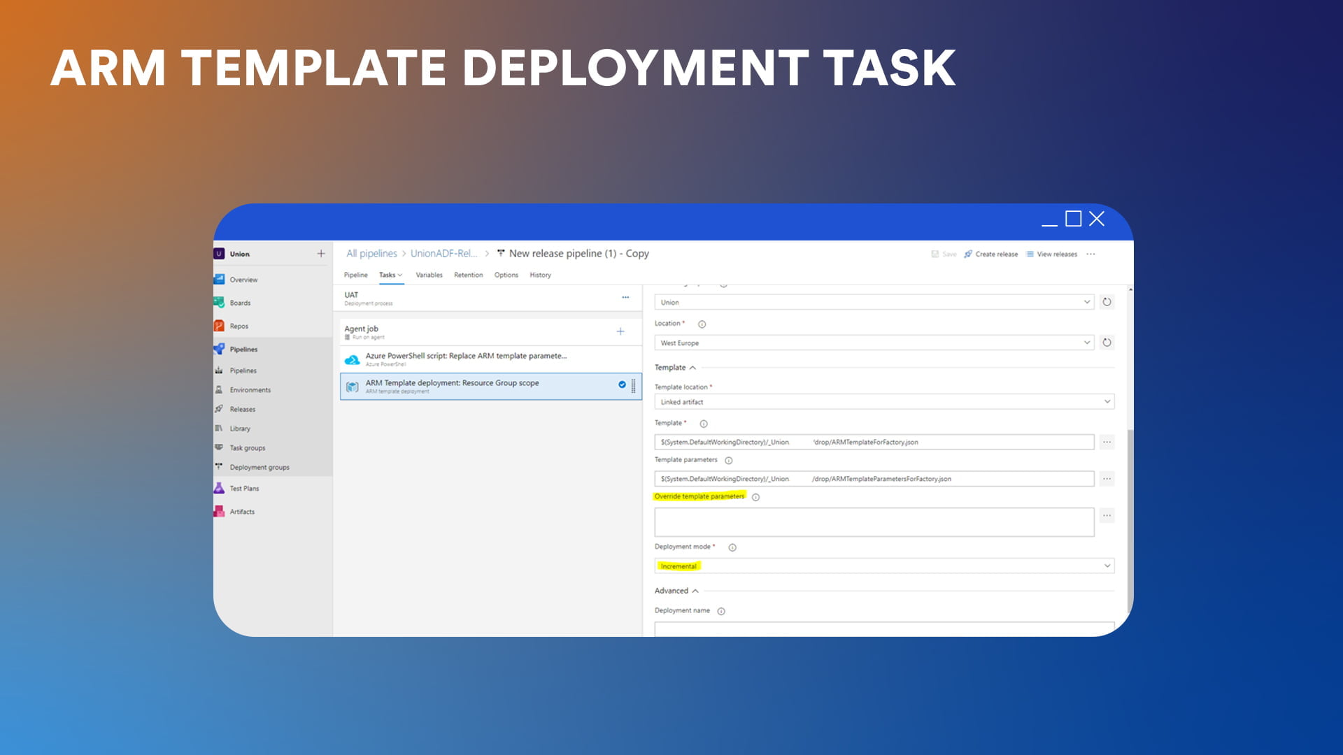 This is the last step of the release pipeline. Without a PowerShell script, this step would have required manual replacement of ARM template parameters every time there was a new service link or data source.