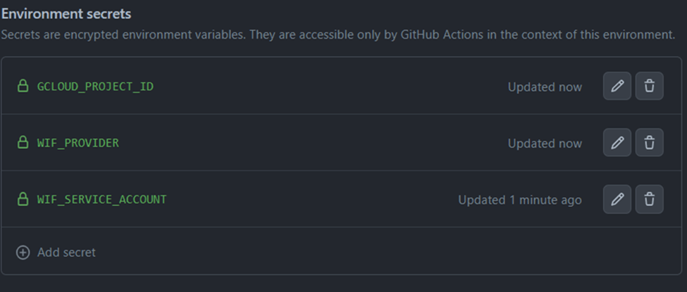 I chose Environment secrets for privacy reasons. Be sure to fill in the correct values for GCLOUD_PROJECT_ID, WIF_PROVIDER, and WIF_SERVICE_ACCOUNT. You should have the Identity Federation values from the initial set up of WIF, but they can also be fetched: you can use the CLI or the Cloud Console by navigating to IAM & Admin -> Workload Identity Pools and Service Accounts.