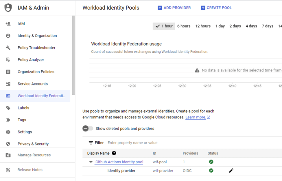 We are almost ready to test this out. However, since the workflow utilizes Workload Identity Federation (WIF) for authentication, a service account and provider will need to be configured if you don’t already have them in place. The setup can be done via the Cloud Console or using the gcloud Command Line Interface (CLI) as explained here.