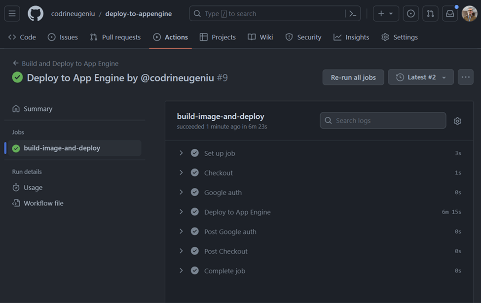 Once that is done, just create or checkout the “gcp-deploy” branch and push some code to it. This will trigger the build and the deployment to the App Engine.