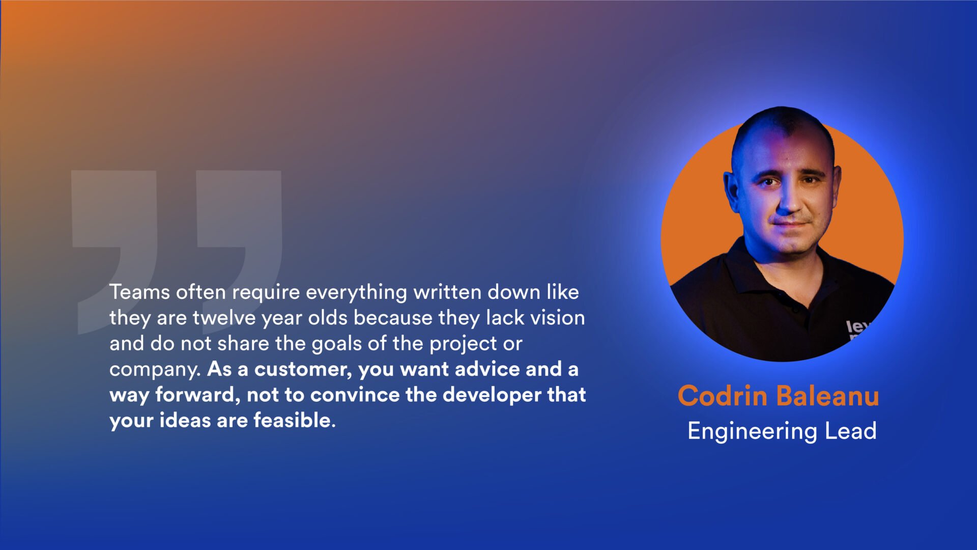 But what if the opposite is true? If a client knows precisely what it wants? Codrin Băleanu remembers a case when he received a 500-page book detailing the specifications of a project. He recalls that it included everything, from table names to column sizes and data types for classes and interfaces. The issue was that by the time the team started implementing the project, new technologies had emerged. Codrin explained to the customer that “We can shave six months of development time just moving to this new client-side architecture.” However, it couldn’t be done because it wasn’t in the book.