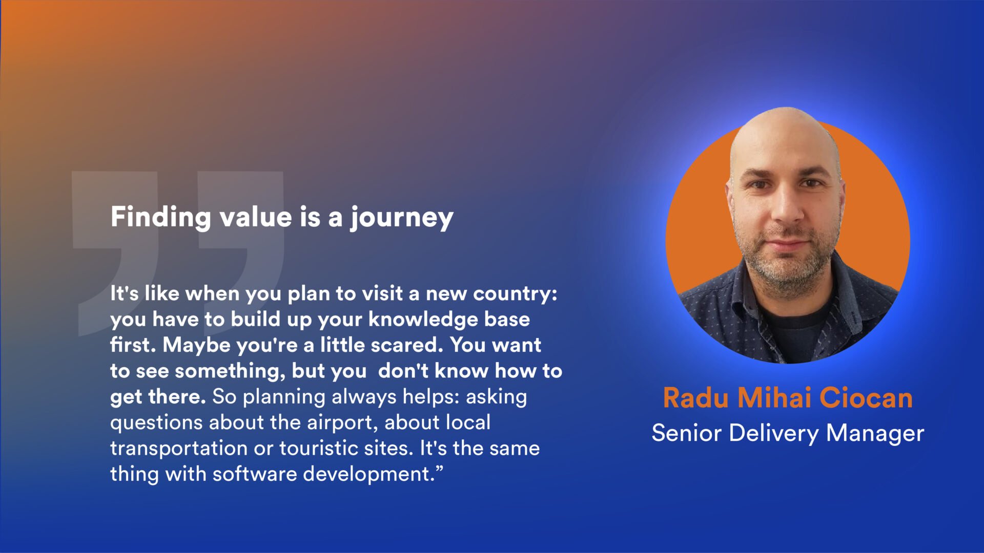 When it comes to providing value to consumers, developers play a critical role. However, as Radu and Codrin explain, it is crucial to recognize that value may be a complicated and subtle term. “Value has different forms,” says our Senior Delivery Manager, Radu Ciocan. “But it’s not always obvious — it needs to be discovered,” he adds. This implies that rather than assuming they know, developers must take the time to discover what is valuable to their consumers and their business.