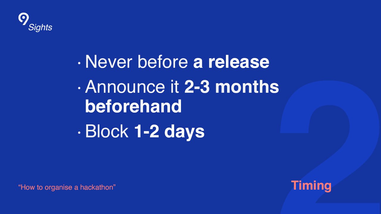 Great! You have decided that a hackathon is just what you and your customer need… so when should you schedule it? Let’s start with when NOT to schedule it: before a release! As a rule of thumb, it’s best to avoid all the stressful periods during a project timeline. Otherwise, topping tight deadlines and delivery pressure with the obligation to think creatively for two days simply adds stress and is completely unproductive.