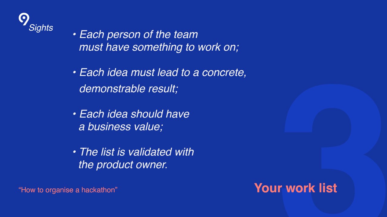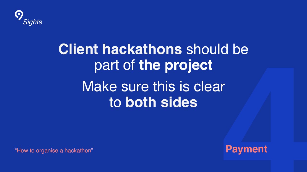 Your team will work for several days straight on these ideas, so make sure you clearly know who is financially supporting this. Customer hackathons are usually part of the project management timeline and the project management budget. However, make sure this is very clear for both sides. As the hackathon might cost the customer some money, you might find yourself in the position of having to “sell” this idea to your customer. In this case, your clear “whys” from the first step will be very helpful.