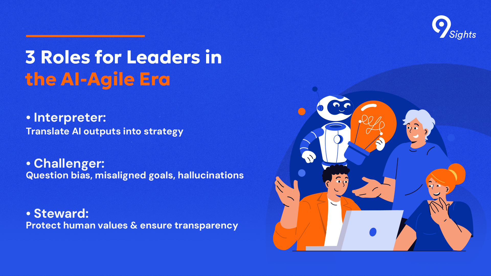 Interpreter – Leadership starts with understanding context, so they have to translate AI outputs (e.g., velocity prediction, sprint anomalies, or user stories generated by LLMs) into strategic decisions. Think of the Product Owner who is using AI to create backlog items but is still applying his domain knowledge and empathy to prioritize the items along with the strategy.
