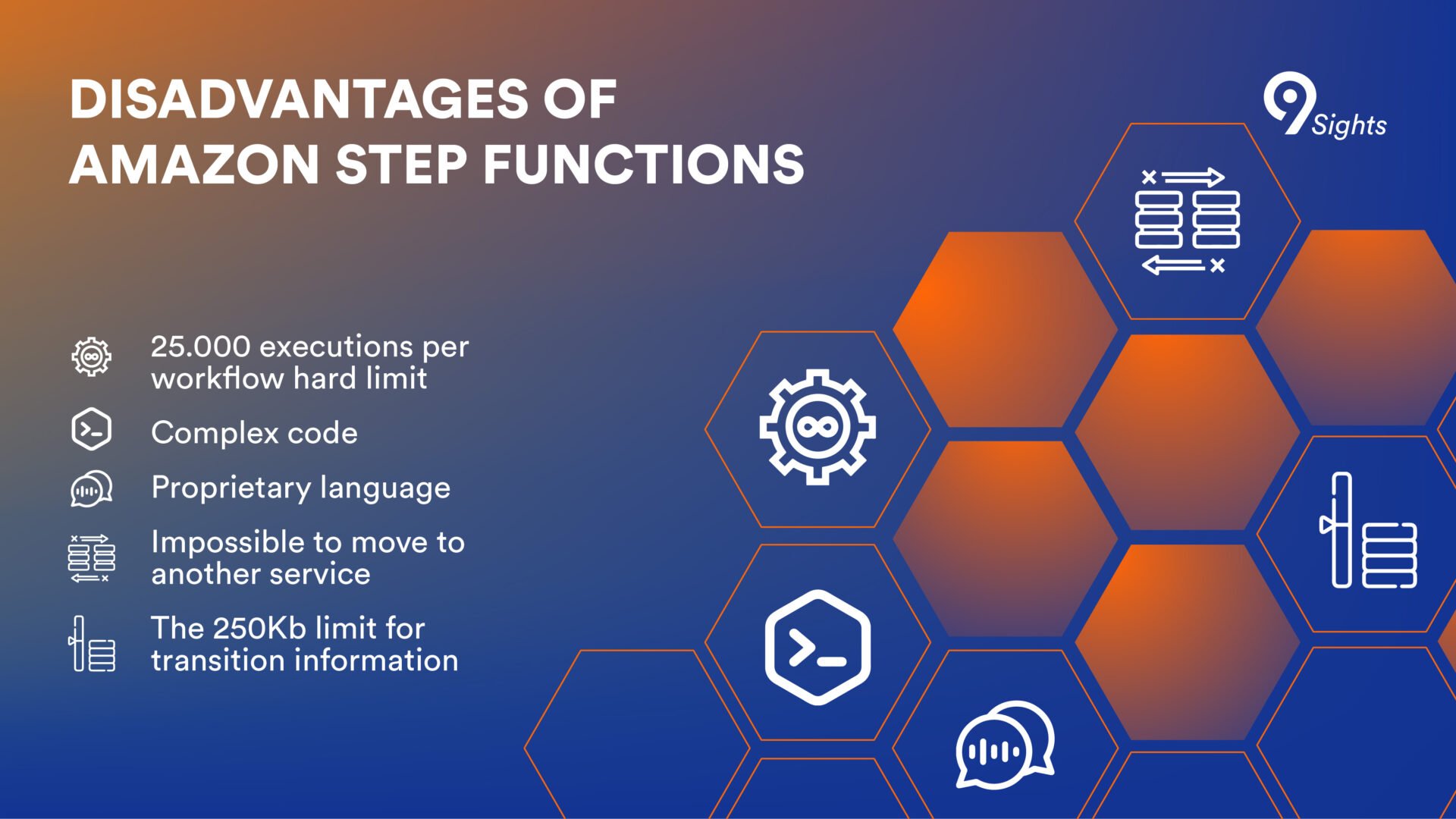 Another disadvantage is the 250 KB limit that can be passed between states in the step function and between transitions. Plus, the execution history is kept for only 90 days, and the maximum execution of a workflow is one year.