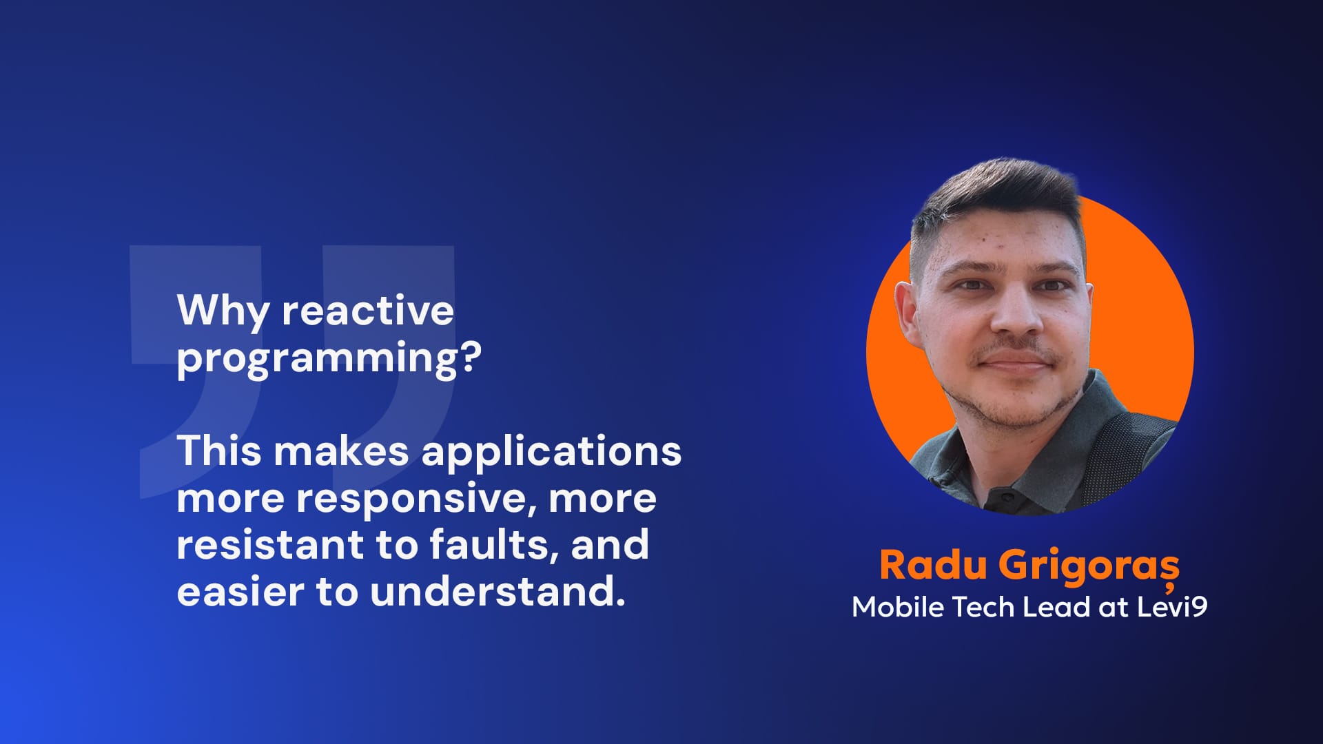 Reactive programming focuses on automatic displays of changes in the data flow, such as the price change for a stock. Instead of providing detailed step-by-step instructions, developers specify how the application should respond to events and changes in data. “This makes applications more responsive, more resistant to faults, and easier to understand”, says Radu Grigoraș, Levi9 mobile tech lead. As the logic for asynchronous operations is all in one place, the resulting code is usually cleaner and easier to maintain.