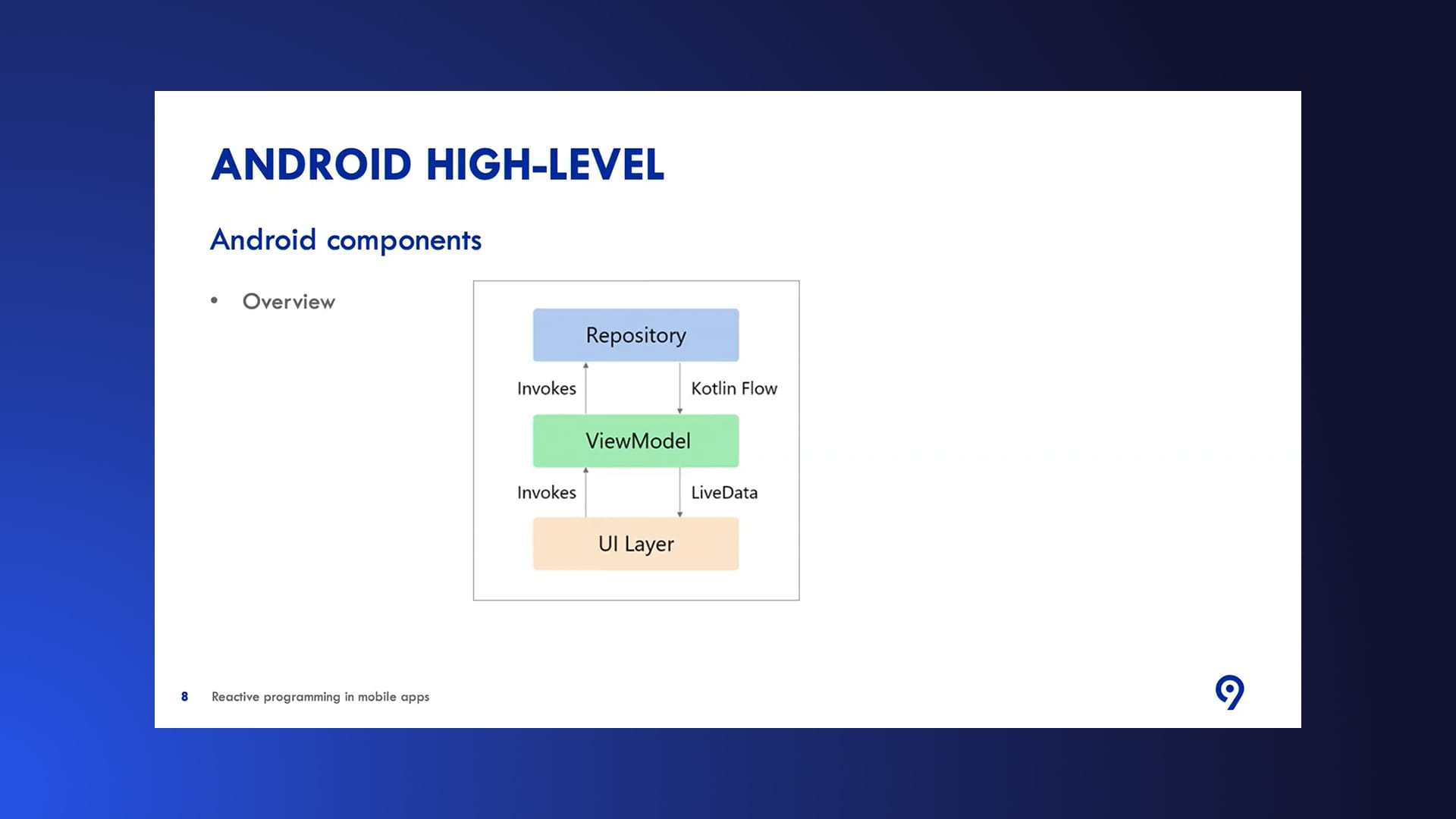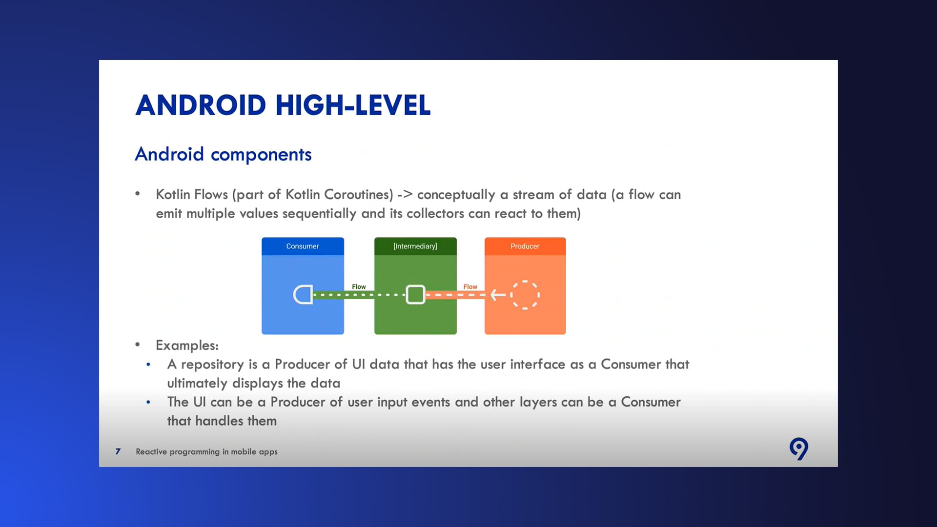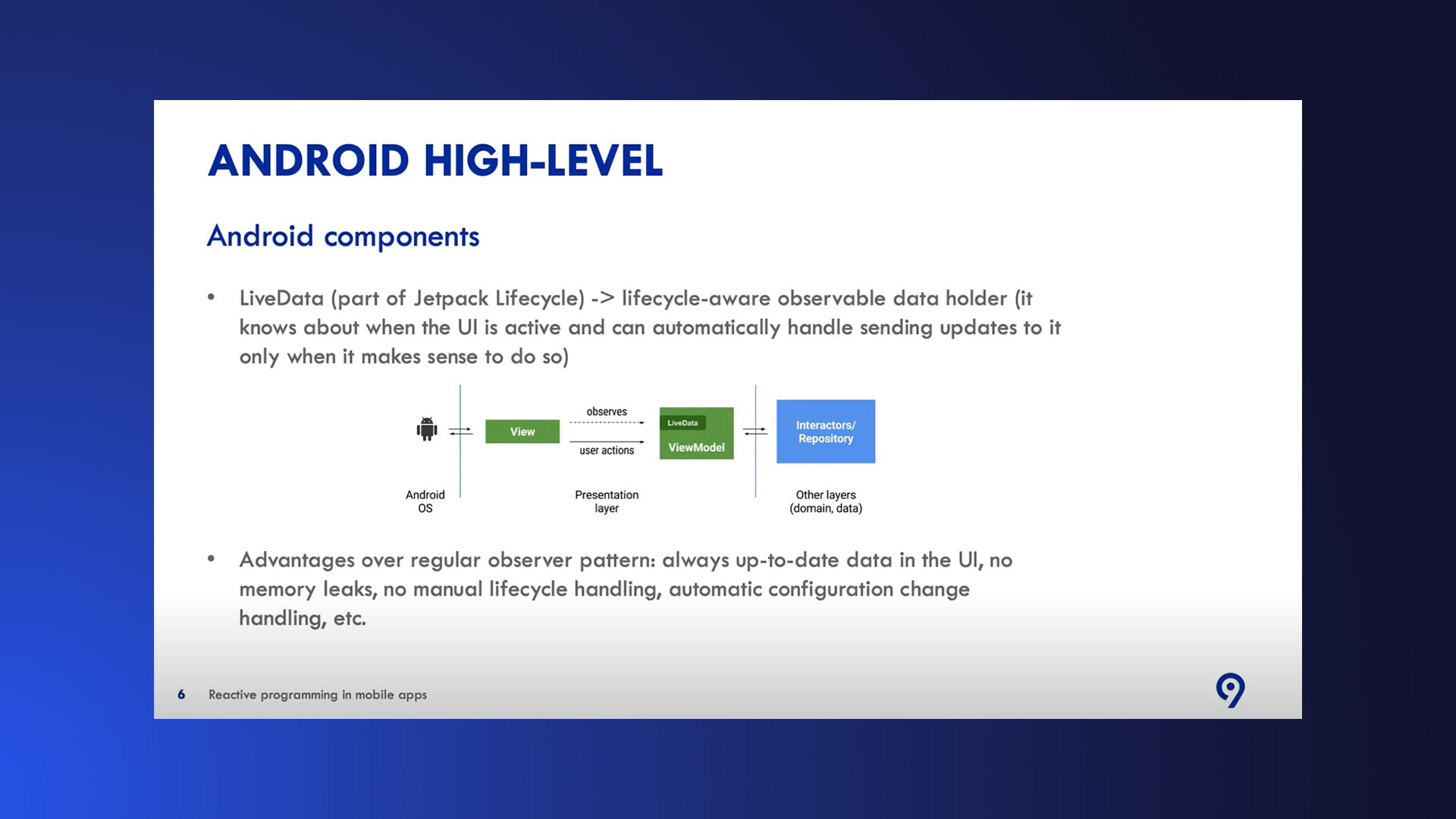 For Android, reactive programming is supported by two essential components: LiveData and Kotlin Flows.