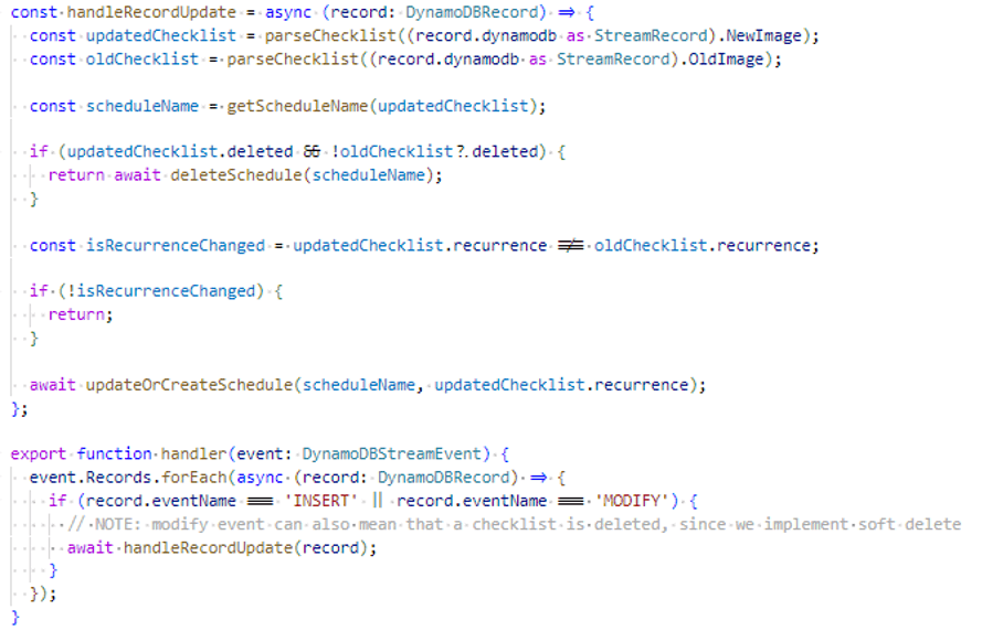 In order to handle this, we set up a “listener” AWS Lambda function, which would act upon any changes to the checklists in our DynamoDB table, leveraging DynamoDB Streams. When a recurrence is updated, the listener updates the corresponding EventBridge Schedule as well, to ensure it reflects the correct timing.