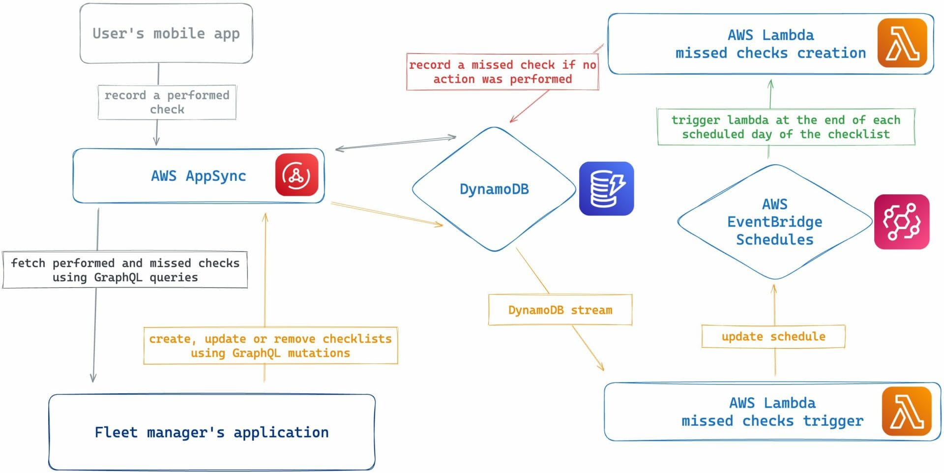 The checklists themselves are managed by our application and stored inside a DynamoDB Table. Our equipment fleet managers can create, update, or remove such checklists – each checklist has its own recurrence, like “every Monday” or “the 1st of every other month”. This adds a layer of complexity since any change in a checklist’s schedule needs to be reflected on the corresponding EventBridge Schedule.