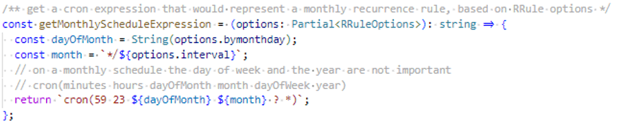 Here is a simplified example of how a conversion from monthly frequency recurrence to the equivalent cron expression could look like: